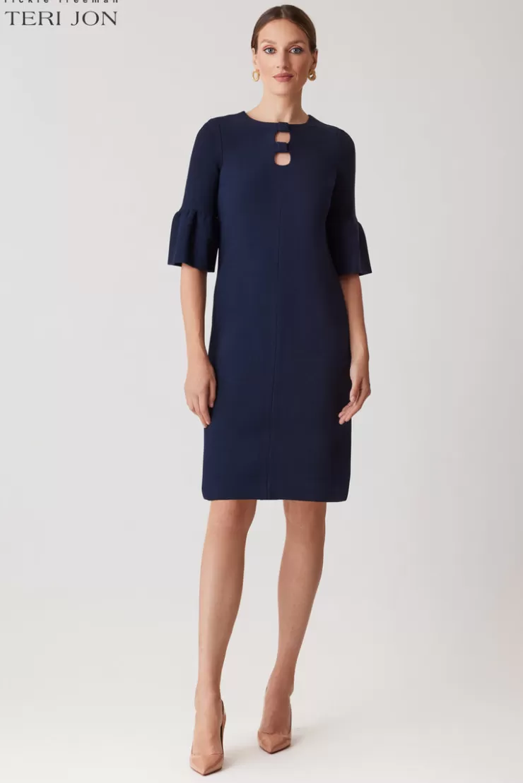 You cannot go wrong with this crepe keyhole flounce dress! Designed with elbow sleeves and flounce cuffs, this sheath dress is a great option for any season. Perfect for engagement parties, bridal showers, and rehearsal dinners.