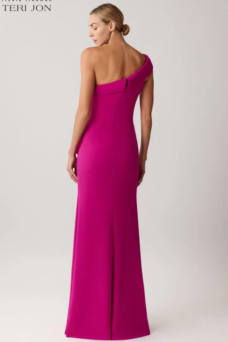 Embrace bold glamour in our hot pink stretch crepe gown where chic meets sophistication! The off the shoulder neckline, delicate side drape, and front slit add a touch of allure, while the artful draping through the bodice creates a flattering silhouette. This gown is a statement of modern elegance, perfect for making a memorable entrance at any special occasion. Pair with gold accessories and patent black heels.