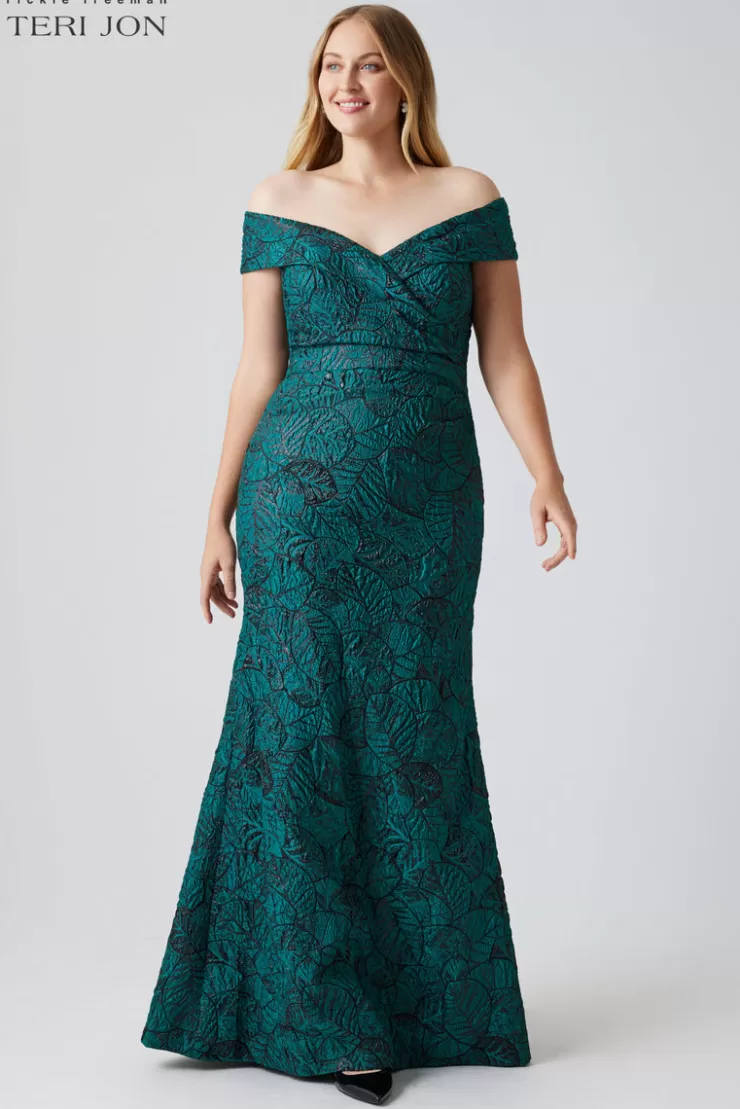 Understated Elegance. This regal gold jacquard evening gown is perfect for an array of special occasions. Wonderfully detailed with a seamed waistline and twist shawl neckline that offers just a hint of sleeve coverage. Pair with gold jewelry and black pumps to finish the look.
