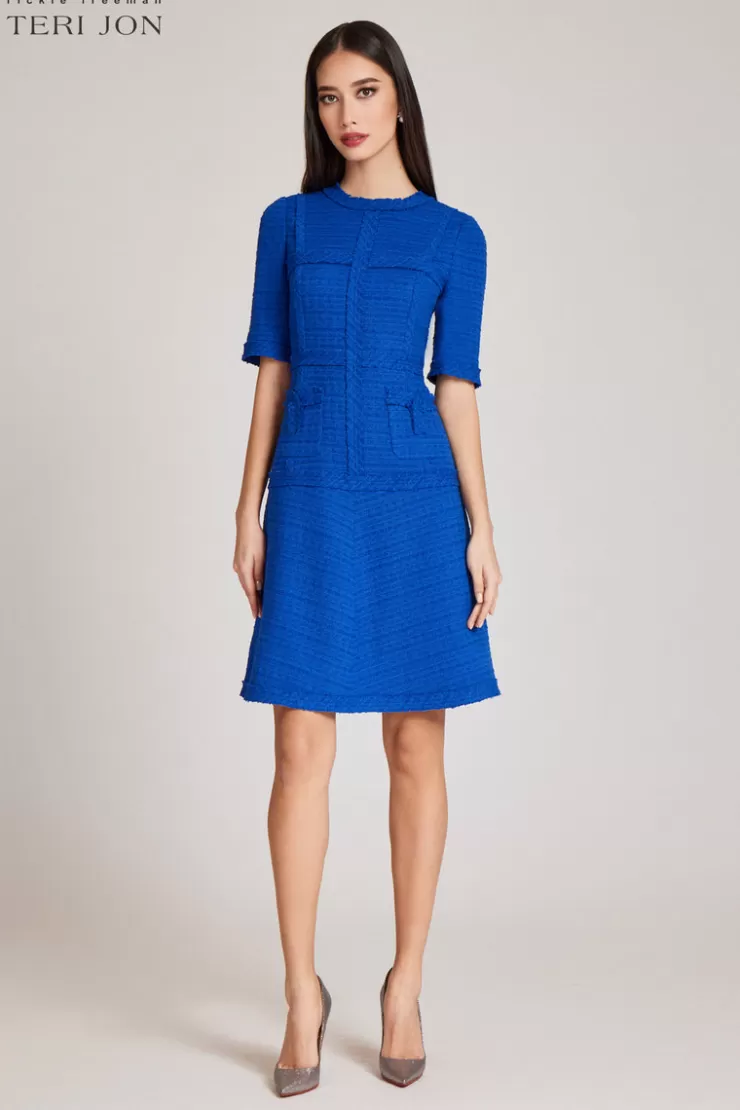 A classic day to dinner dress for all-year-round. This cobalt tweed dress is perfect for an array of occasions, casual or formal. Featuring short sleeves, a knee length cut, and a jewel neckline. Flattering on all this dress is timeless and a closet staple. Pair with nude or silver pumps to complete the look.